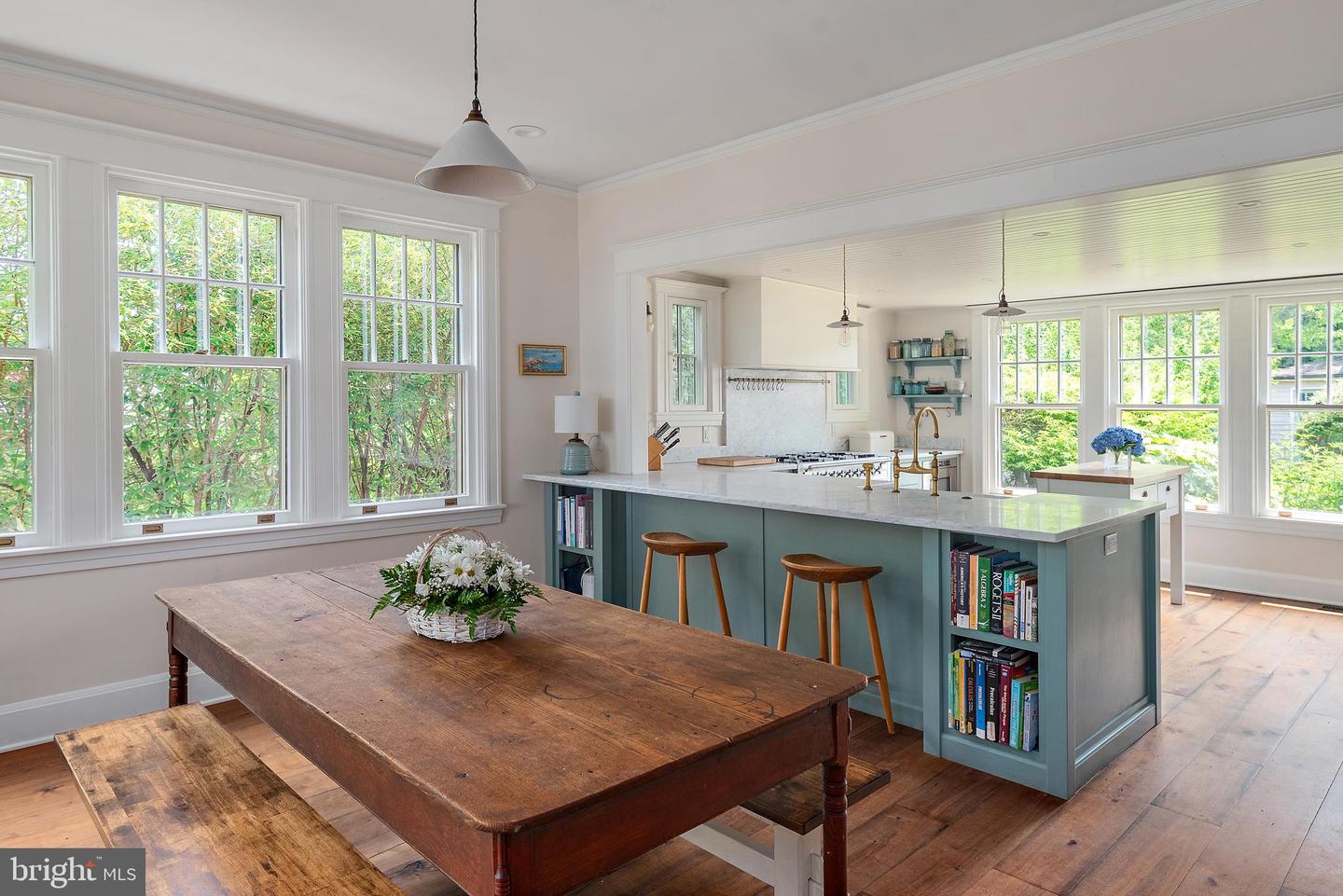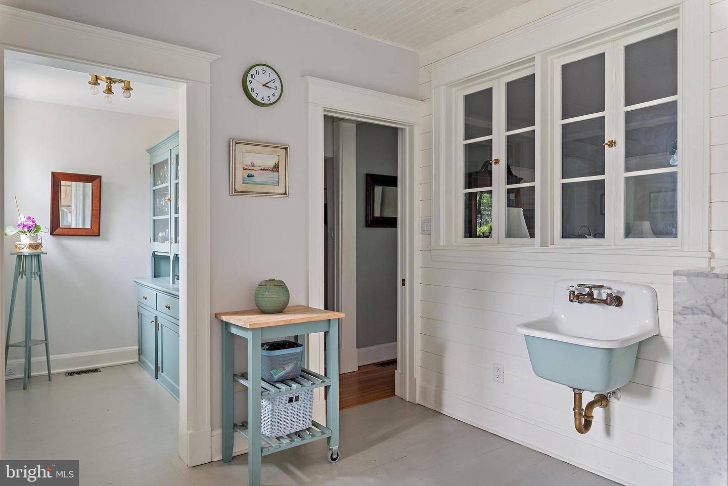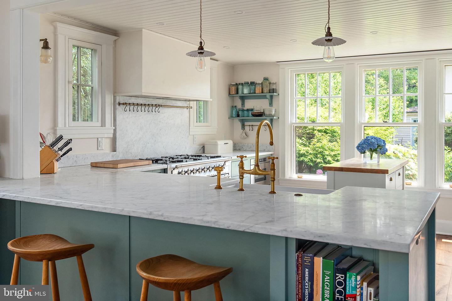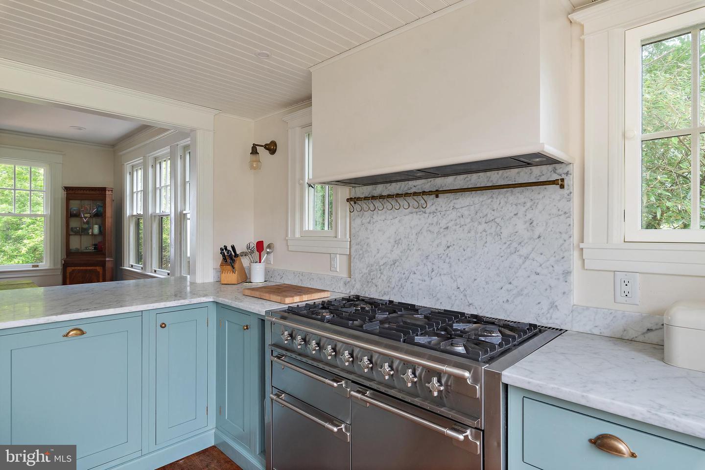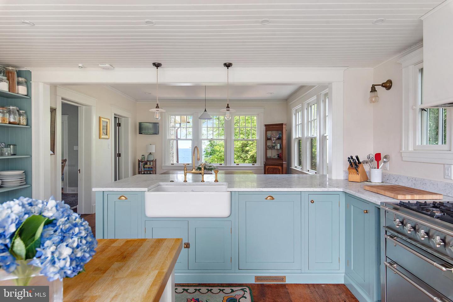 The newly renovated chef’s kitchen blends beauty and function with painted inset cabinetry, white marble countertops, top-of-the-line appliances, a breakfast area, and serene views of the water and rear gardens. Adjacent to the kitchen, a well-appointed mudroom and pantry with restored cabinetry includes a custom dog wash, powder room, and convenient laundry, thoughtfully designed for everyday waterfront living.